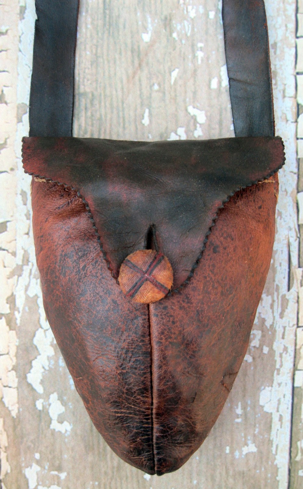 This is an outside-stitched pouch made from hair-on calf and cow hide with pigskin trim. The powder horn was made by Ron Hess.