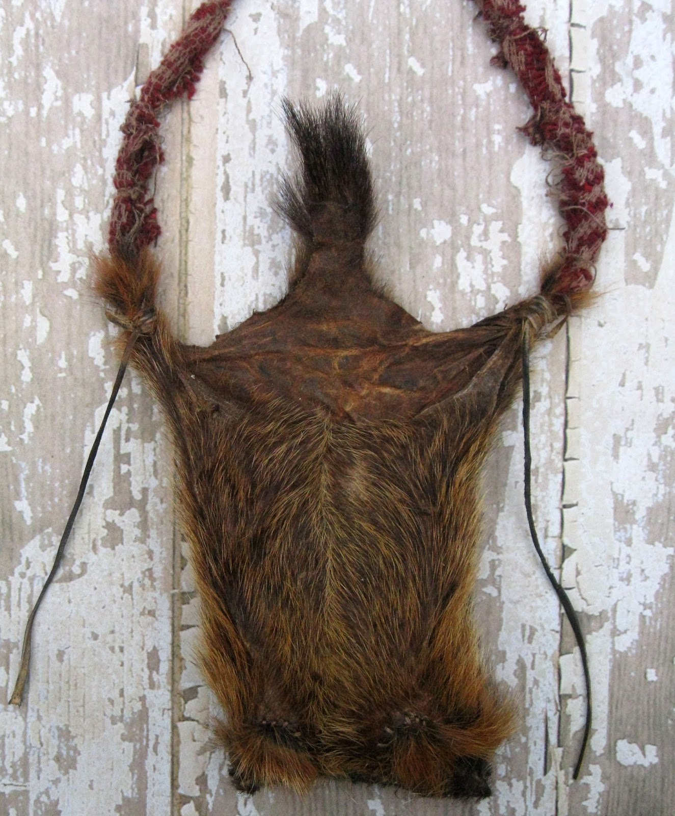 No 134: Case-skinned, alum-tanned woodchuck hide, strap made from twisted overshot coverlet remnants and braintan deer thongs.