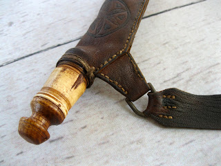 Shot & Ball Pouches; turned antler spouts with wood clothespin stoppers; hemp cord; mix of leather including vegetable tanned goat, bark tanned deer, vegetable tanned cowhide, vegetable tanned deer.