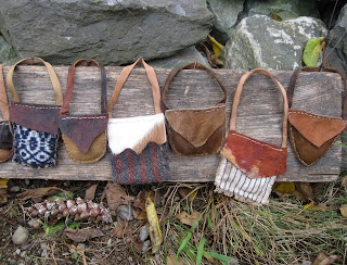 No. 222: Belt pouch made with antique overshot coverlet, linen, barktan deer, braintan deer, antique bone button.